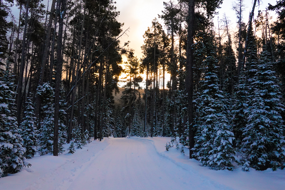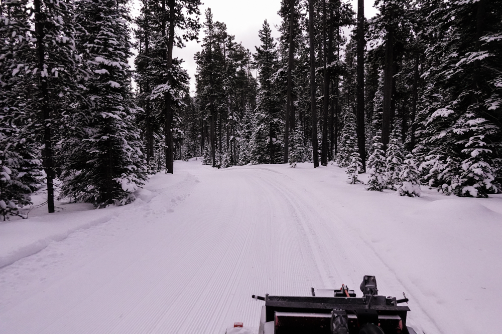 As requested, track was set with the little groomer. It doesn’t make very deep classic track on the hard pack conditions. Also, it is stuck in the “down” position, so some of the trail crossings and turn around spots can be a little confusing for people following the tracks. Usually we lift the track setter at those places to make it easier to follow trails.