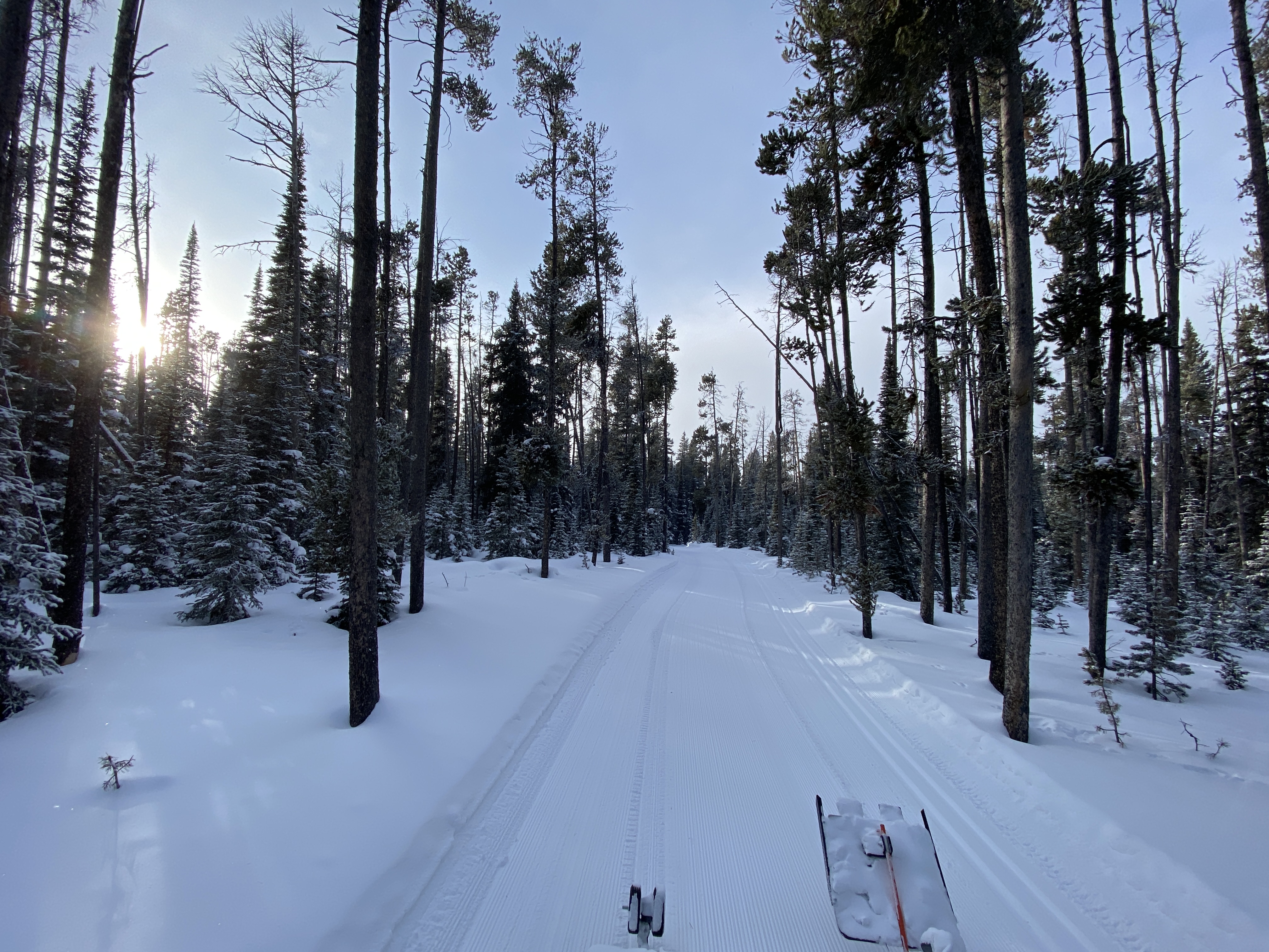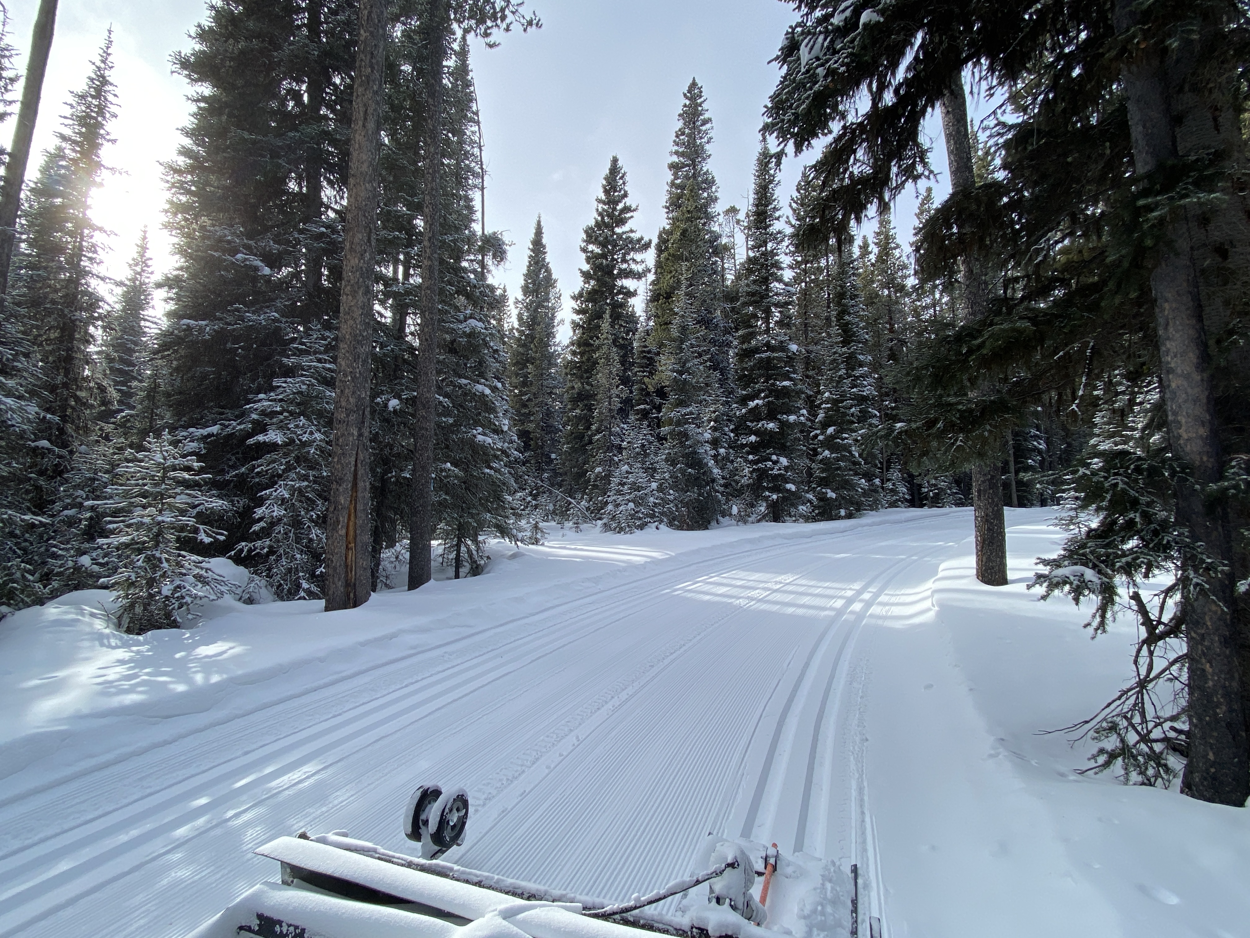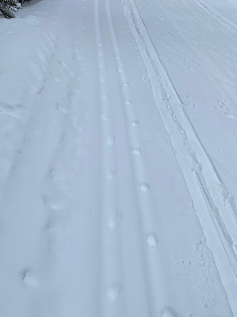 Groomed away the new snow and wind drifts. All trails groomed and track-set. Silver Dyke, Wu Tang, Quicksilver and Sluice Box with tracks on both sides of the trail for couples, and the Outer Loop, E and Gold Run for skaters, with only one set of tracks and triple-pass to make a center skate deck.