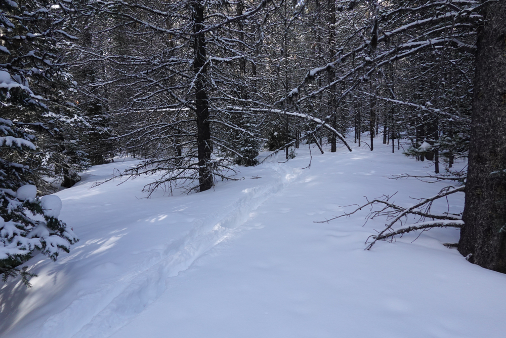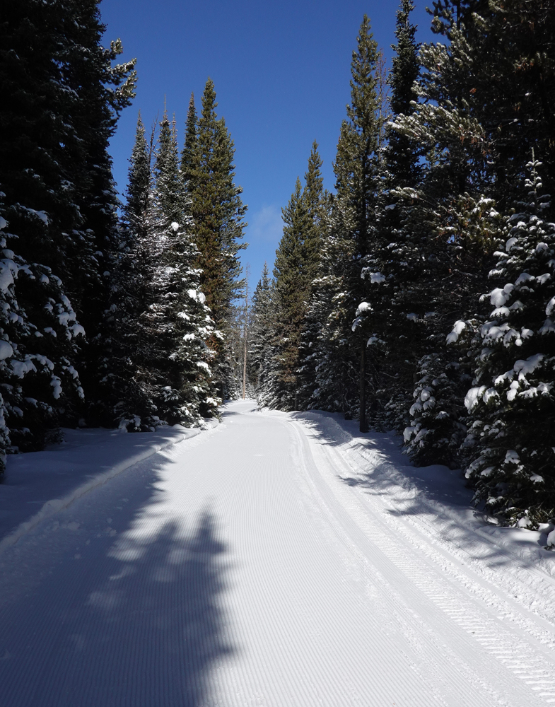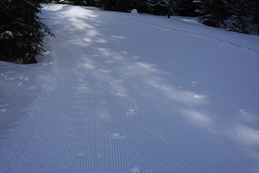 The little ginzu groomer is just not capable of punching through the hard pack left by the big groomer on cold snow. You can see by the elk tracks how hard the pack is. That cow/calf pair were running, probably to get away from me!