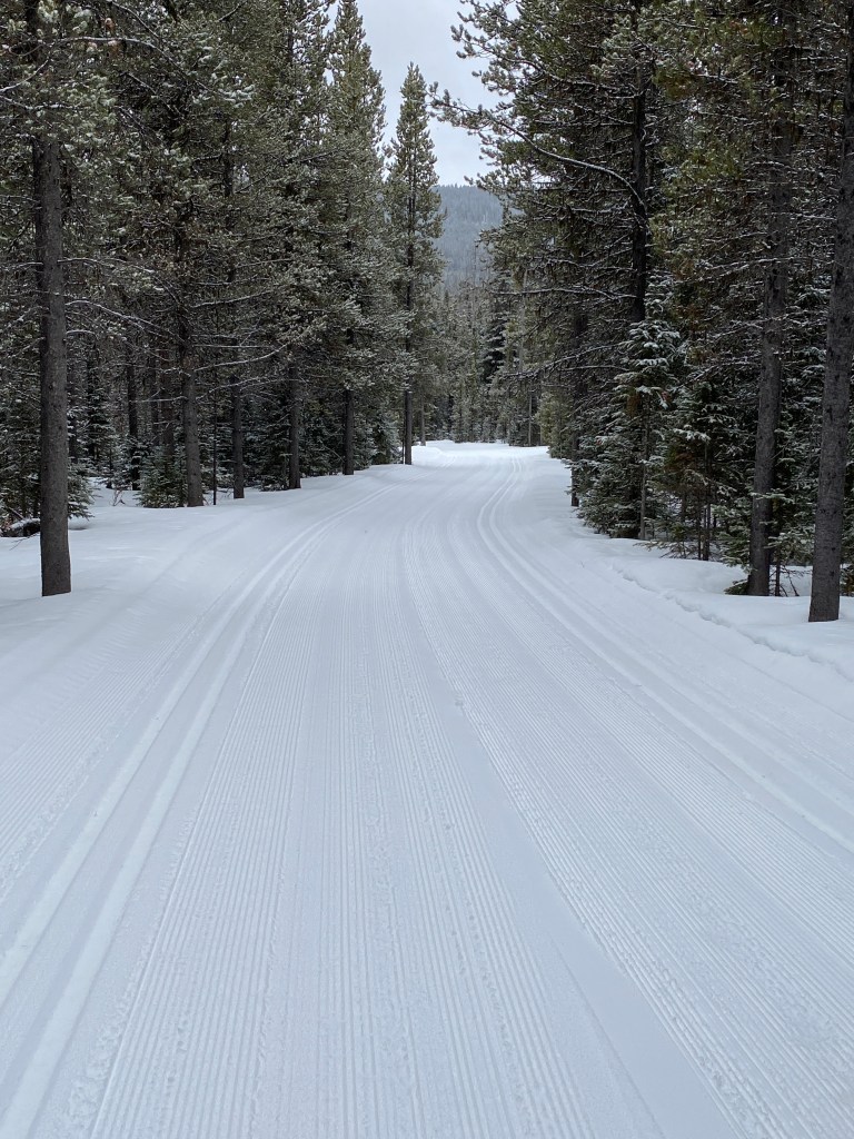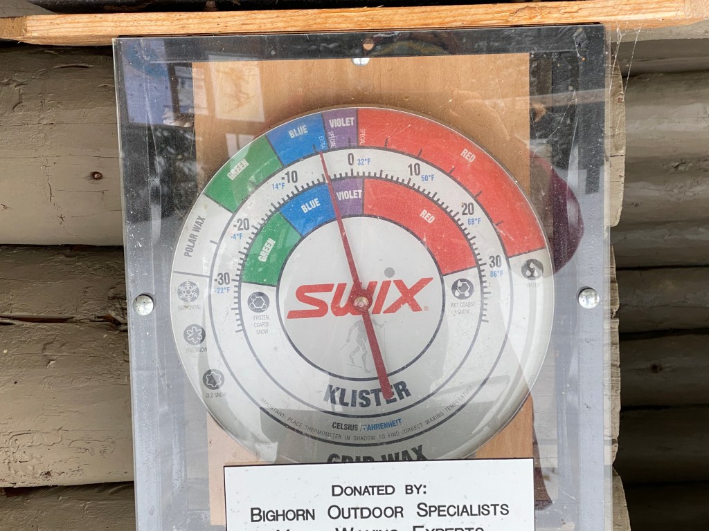 Its been above freezing day and night for a few days. Today its a little cooler – in the blue/violet wax range. The big groomer didn’t want to risk sinking in the soft snow, so didn’t go out last night. All trails groomed and track-set: two sets of classic track on WuTang, Silver Dyke, Sluice Box and Quicksilver. The outer loop has one set of classic track and got a triple-pass to make a skate deck.