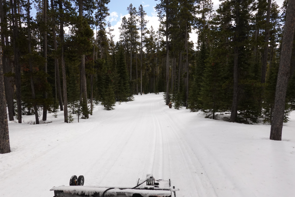 All trails are groomed, some are track-set. It took three passes to eliminate all the old, criss-crossing classic tracks. There wasn’t enough time or sunshine (to soften the snow) to set track everywhere. Nice, flat surface, tho.