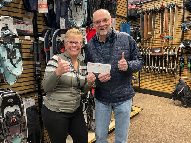 SCHEELS’s Wendy Lee and Silver Crest Trails Association’s volunteer fundraising coordinator Bob Norbie pose with the $5,000 donation check, given to help fund the purchase of a new UTV Snowcat Grooming machine. A HUGE Thank You to SCHEELS Sporting Goods for their support of local Winter Recreation!